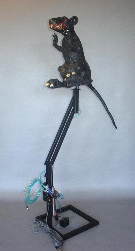Price includes all mechanics, non-posable 18″ latex Rat, spitting mechanism, and hand held push button controller. Requires 110V power and a compressor with 100-120 PSI.